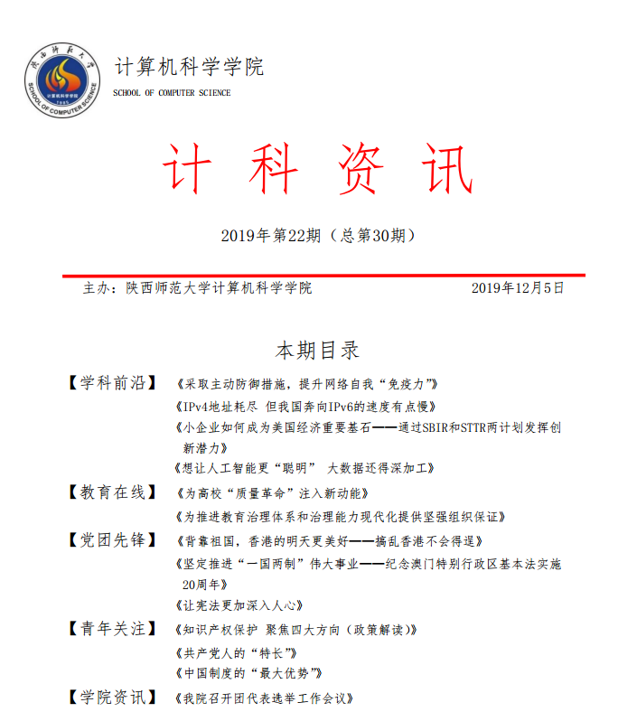 《计科资讯》是91猫先生 编辑整理的电子资讯,信息来源为《光明日报》《人民日报》《中国青年报》等权威纸媒,编辑工作由学院优秀本科生党员、团员承担。《计科资讯》主要包括学科前沿、教育在线、党团先锋、青年关注及学院资讯五个版块。学院师生可以从中了解到专业前沿和国家时政大事,欢迎大家下载阅读。