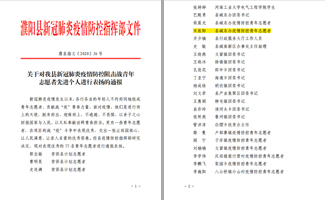 3月14日,学院收到了来自河南省濮阳县新冠肺炎防控指挥部文件,对疫情防控工作中的优秀青年志愿者进行了表扬。91猫先生