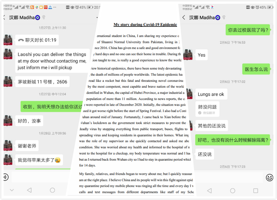 1月22日,学院留学生因从武汉开会返回而居家隔离医学观察。学生隔离期间,正值农历春节,学院安排专人,先后6次为其购买生活物资并送到学生所在小区。学生导师以认真负责的态度,每天与学生通过网络交流,关注学生身心健康。14天隔离期满后,学生因身体原因延长隔离7天,学院积极协助校医院和社区卫生机构,排查原因解决问题。