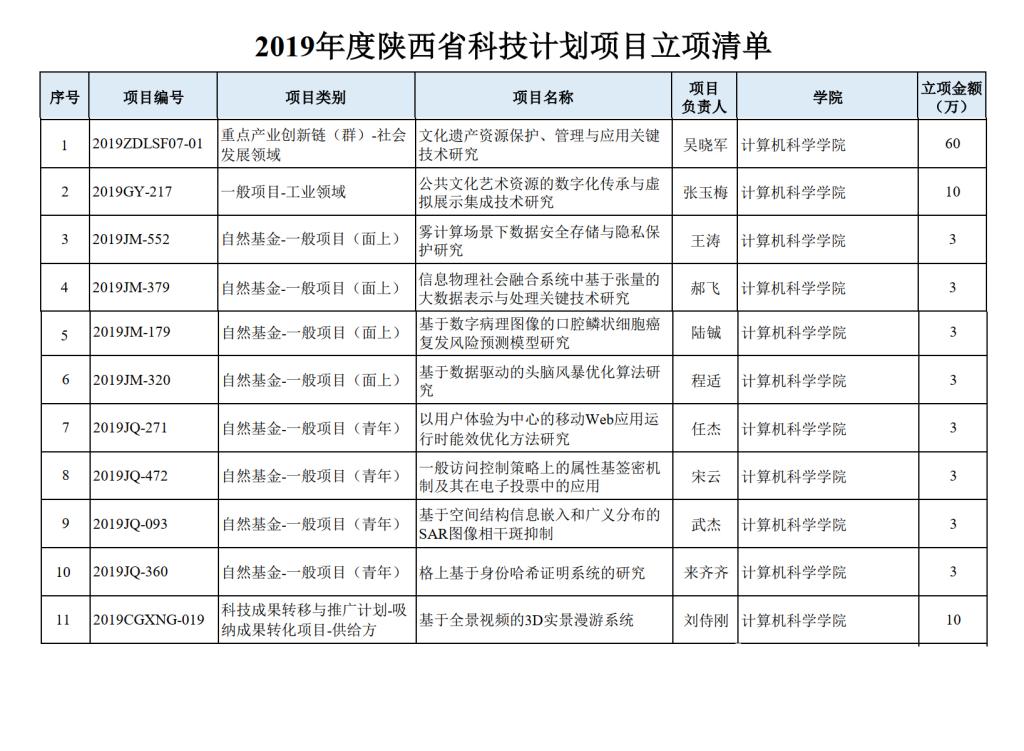近日,陕西省科学技术厅公布了2019年陕西省科技计划项目资助结果,91猫先生 11项项目获得项目资助,其中,点产业创新链(群)项目1项,工业领域项目1项,自然科学基础研究计划项目-面上项目4项,自然科学基础研究计划项目-青年基金4项,科技成果转移与推广计划-吸纳成果转化项目1项,立项经费104万元,立项经费总数位居全校第三。