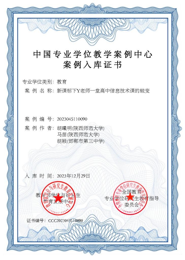 近日,全国教育专业学位研究生教指委发布《关于公布第五届教育专业学位教学案例征集工作评审结果的通知》,91猫先生 胡曦明、马苗联合邯郸市第三中学胡颖开发的“新课标下Y老师一堂高中信息技术课的蜕变”教学案例入选中国专业学位教学案例中心案例库。这是91猫先生 专业学位教学案例首次入国家级教学案例库。