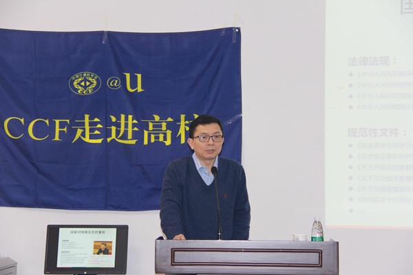 报告前,王小明院长发表了热情洋溢的致辞,并一同观看了CCF宣传片。随后,谭晓生先生以幽默的方式做了开场白,并介绍了CCF的有关情况及其近几年来的发展。接着,谭晓生先生从信息安全方面的专业知识开始,介绍近几年国际国内的热点网络安全事件,及网络空间安全技术的发展,通过安全防御实例说明网络安全及相关技术的重要性。谭晓生先生还通过个人的发展,用自己的亲身经历告诉同学们在大学应该修炼的能力及如何规划自己的未来生活。分享职业发展相关的内容及安全网络岗位的相关信息。他指出,在竞争压力很大的现代社会,必须有良好的心智,要有所追求,从一点一滴锻炼自己,充实自己。