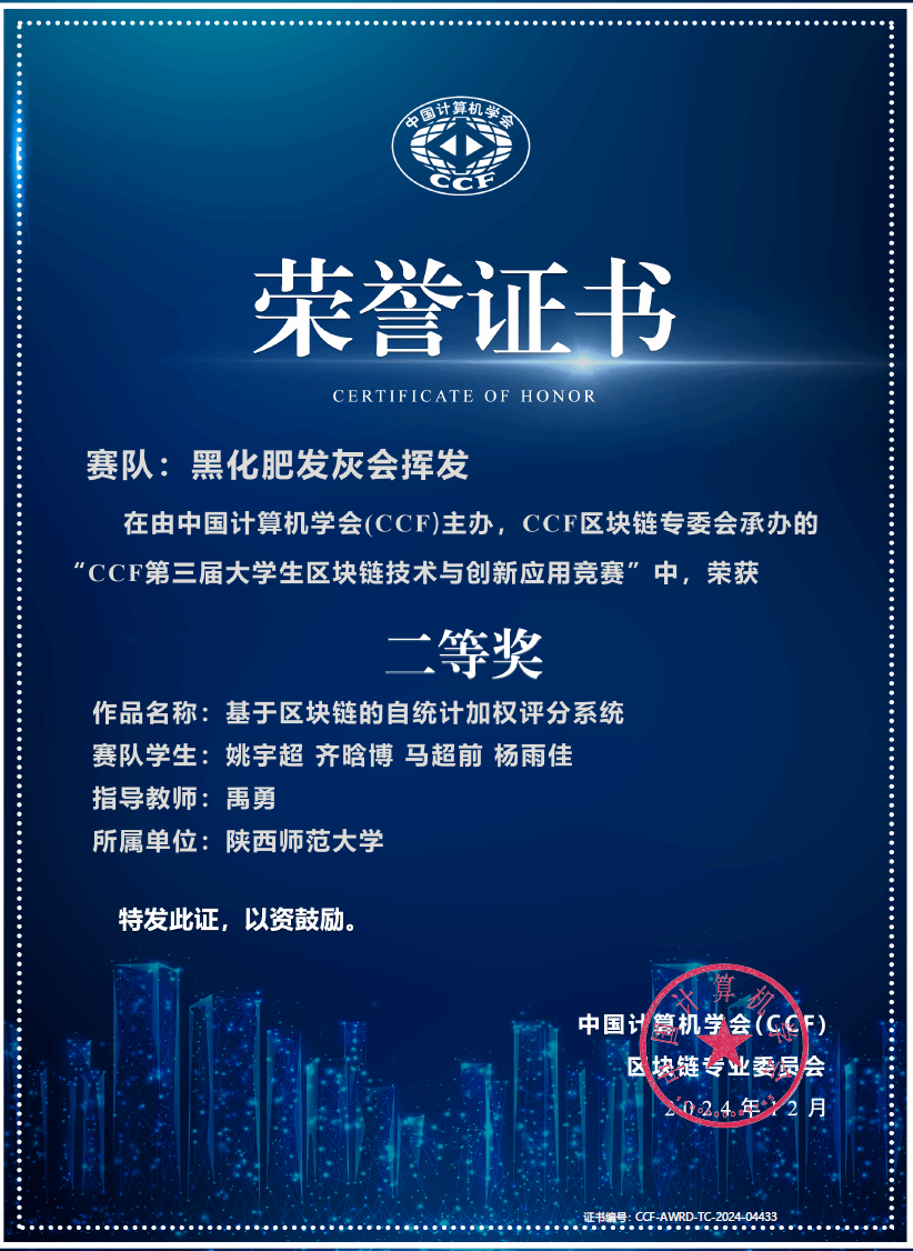 禹勇教授指导,姚宇超、齐晗博、马超前、杨雨佳组成的团队,凭借其创新作品“基于区块链的自统计加权评分系统”成功晋级决赛。在决赛的现场答辩、作品展示及专家评审环节中,团队成员凭借扎实的专业知识、创新的技术方案以及出色的团队协作能力,赢得了评委的一致好评,最终荣获二等奖,禹勇教授被评为优秀指导教师。