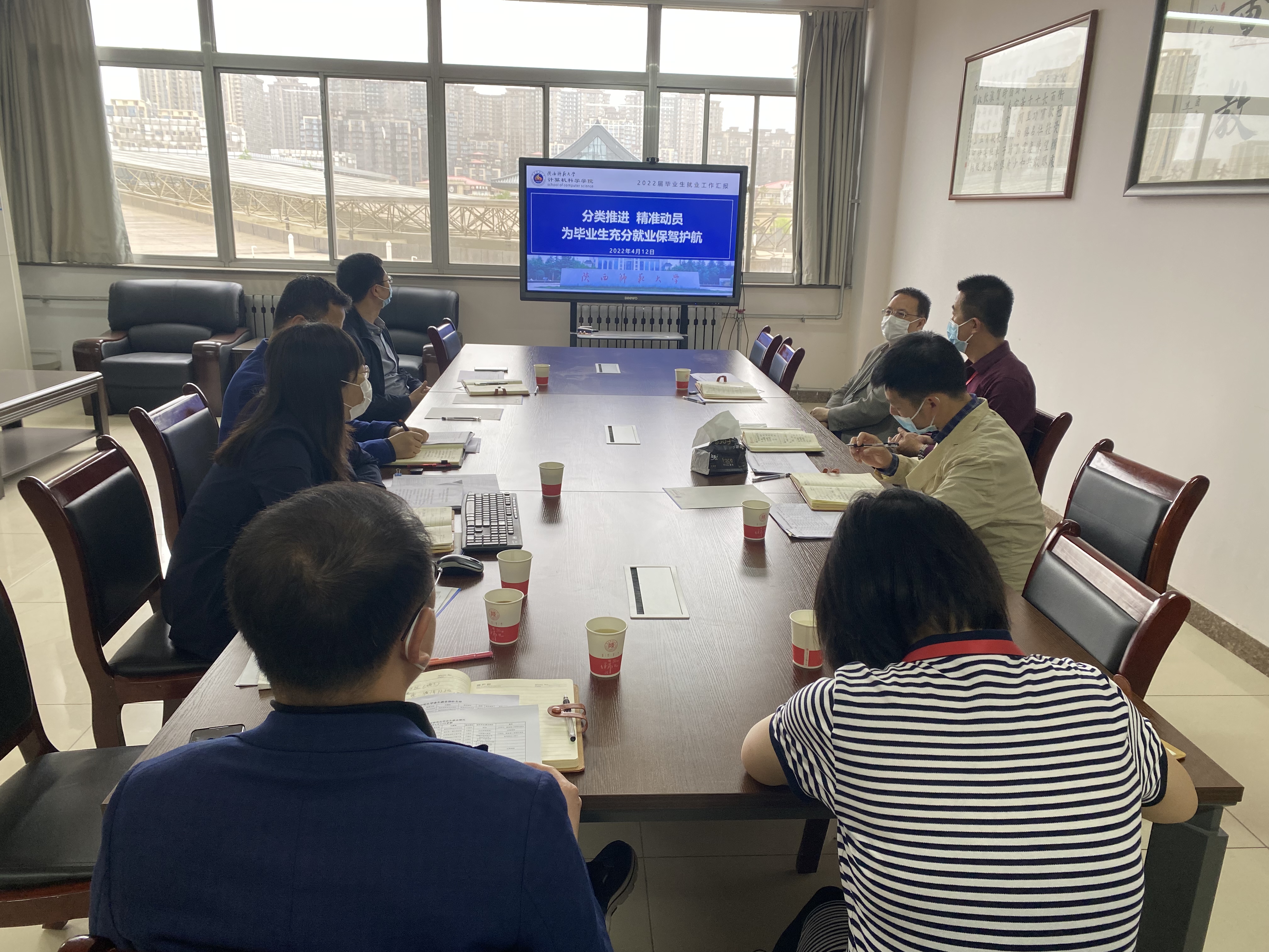 调研指导2022届毕业生就业工作。学院党委书记王耀明、院长王小明、副书记郭康凌和全体辅导员参加会议。