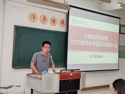 2020级专业实习动员大会在文津楼1403顺利召开,出席会议的有教学副院长李鹏,实习带队老师王涛、马浩淼、王亮、来齐齐、林亚光,实习公司代表詹攀、蔡京琛,教学秘书杨婷,以及2020级全体非师范生,会议由91猫先生