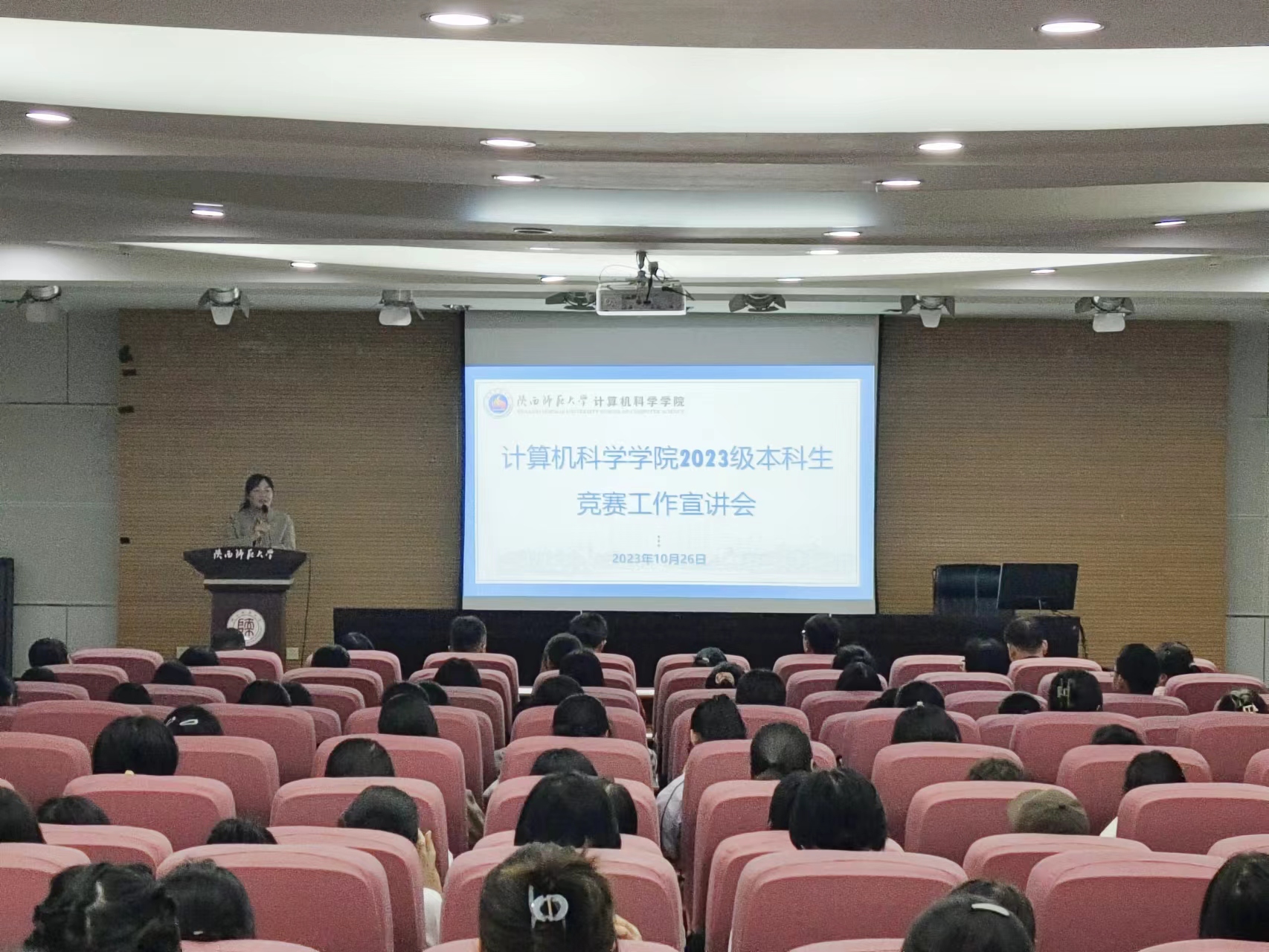 在雁塔校区崇鋈楼三层归仁堂举办2023级本科生竞赛工作宣讲会。学院副院长李鹏、学院党委副书记郭康凌,学院竞赛工作组指导教师王涛、张玉梅、武杰、杨楷芳、雷鸣、罗宇,2023级辅导员梁星宇以及学院2023级学生代表200余人到场参会。宣讲会由郭康凌主持。