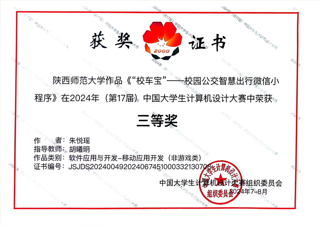 计算机科学与技术专业创新实验班本科生朱悦瑶的项目“‘校车宝’-校园公交智慧出行微信小程序”在西北地区赛中获一等奖并入围国赛,经过国赛现场答辩、作品展示、专家综合考察等比赛环节,荣获三等奖。该项目由胡曦明老师指导。