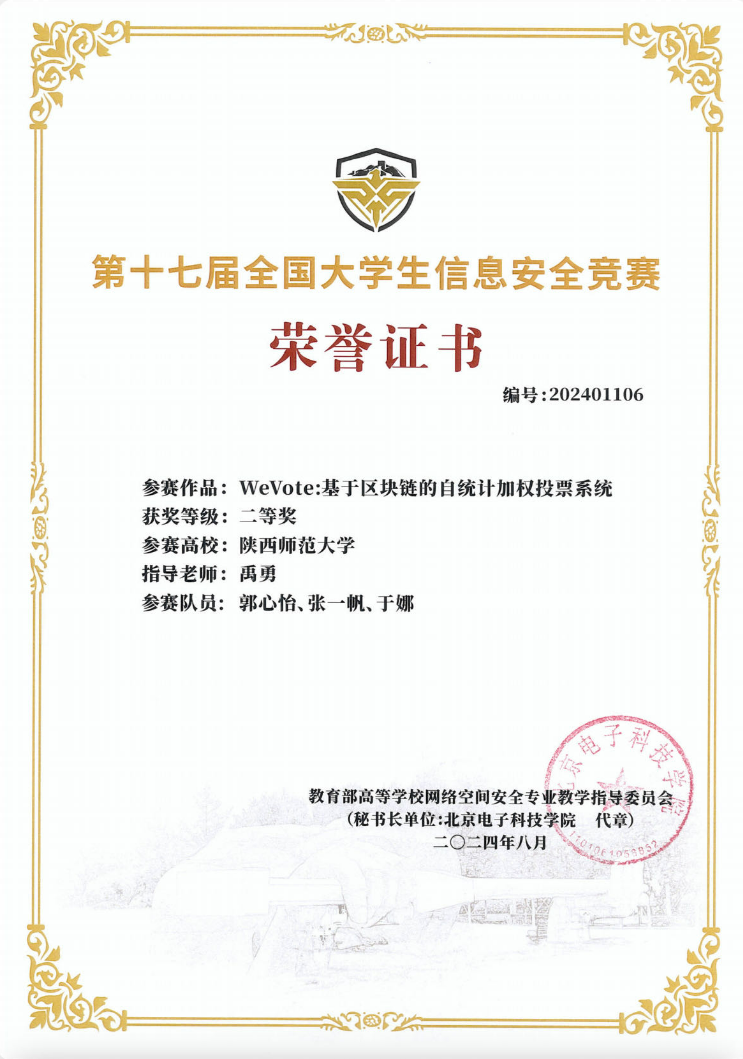 禹勇教授作为指导教师、本科生郭欣怡、张一帆、于娜组成的团队,凭借其创新作品“WeVote:基于区块链的自统计加权投票系统”脱颖而出,成功晋级国赛。在国赛的现场答辩、作品展示以及专家的综合评审环节中,表现出色,荣获二等奖,展现了学院学子扎实的专业素养和卓越的创新精神。