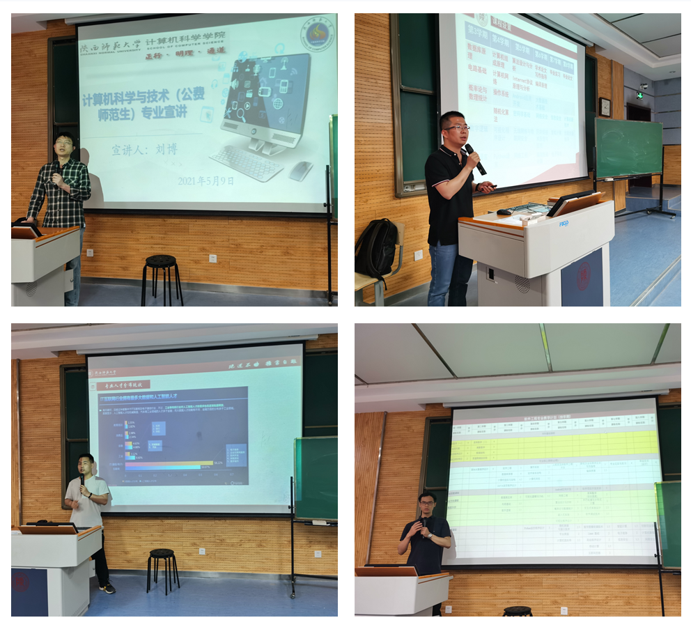 会议首先由计算机科学与技术(公费师范生)、计算机科学与技术(创新实验班)、软件工程以及人工智能四个专业的负责人刘博、王亮、武杰、田丰四位老师对各专业进行了宣讲。为院内外学生开展专业分流指引,同时也通过展示毕业生去向、院内师资队伍、学科发展现状等展示了学院的本科教学实力。