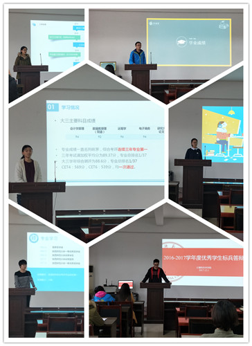 2016-2017学年度各项评优工作的评选条件、评选流程和此次答辩评审会的具体要求。随后,学生陈述答辩正式开始,答辩形式为5分钟的自我展示和2分钟的评委提问,分“优秀学生标兵”和“先进班集体”两个单元进行。在展示环节中,6位“优秀学生标兵”候选人分别从专业学习、品行表现、学术科研、志愿服务、文体艺术等方面对自己在2016-2017这一学年的表现进行展示,4位“先进班集体”的学生代表就班风学风、科研氛围、班级活动等方面对本班级进行了展示。在现场提问环节中,评审工作领导小组就专业科研、职业规划、目标定位、班级建设等方面与各位候选人进行提问和互动交流,同时也对各位候选人给予肯定和指导。