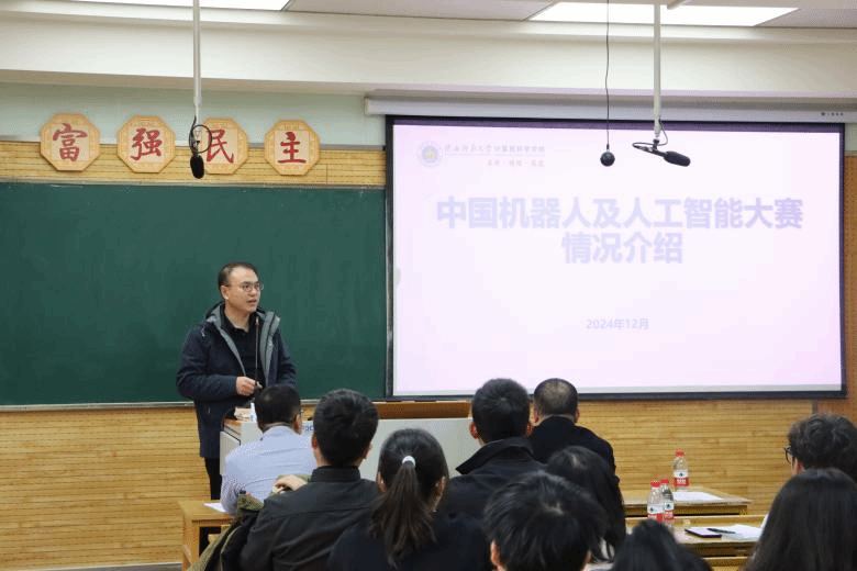 蒋江红以现在国家日益重视人工智能相关产业的背景,引入中国机器人和人工智能大赛相关情况介绍,向同学们推荐了人工智能虚拟仿真平台官网,鼓励同学们根据爱好选择赛道。