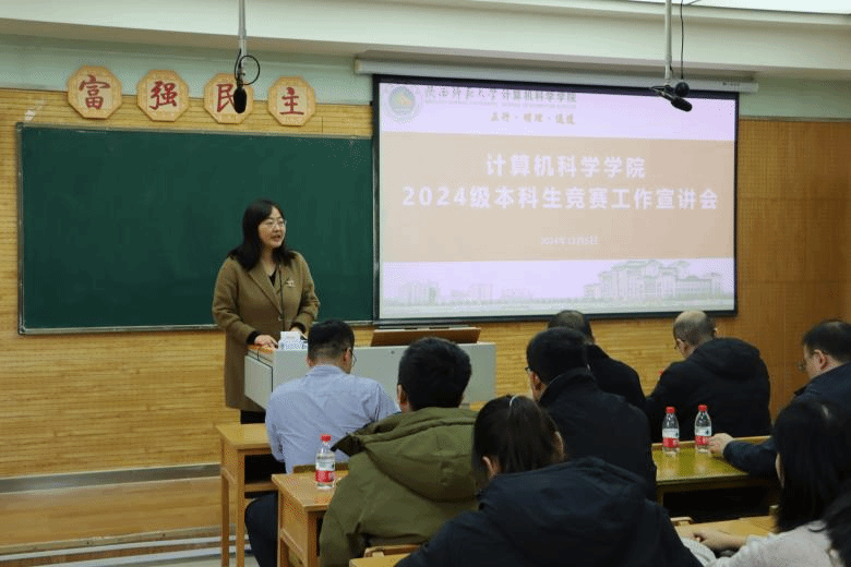 2024级本科生竞赛工作宣讲会在雁塔校区教学五楼5306举行。学院竞赛工作组指导教师王涛、路纲、蒋江红、任杰、胡曦明、雷鸣、罗宇、2024级辅导员张皓然以及学院2024级学生代表参会。宣讲会由党委副书记郭康凌主持。