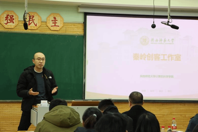 任杰向同学们介绍了秦岭创客工作室。他通过展示工作室学生所取得的优异成绩,展现了秦岭创客工作室作为创新创业平台与资源库,在提升当今毕业生实践能力方面发挥着极为重要的作用。任杰老师有针对性地对师范生与非师范生进行了不同比赛的介绍,号召同学们在竞赛中不断成长进步。
