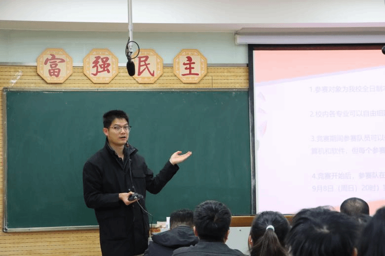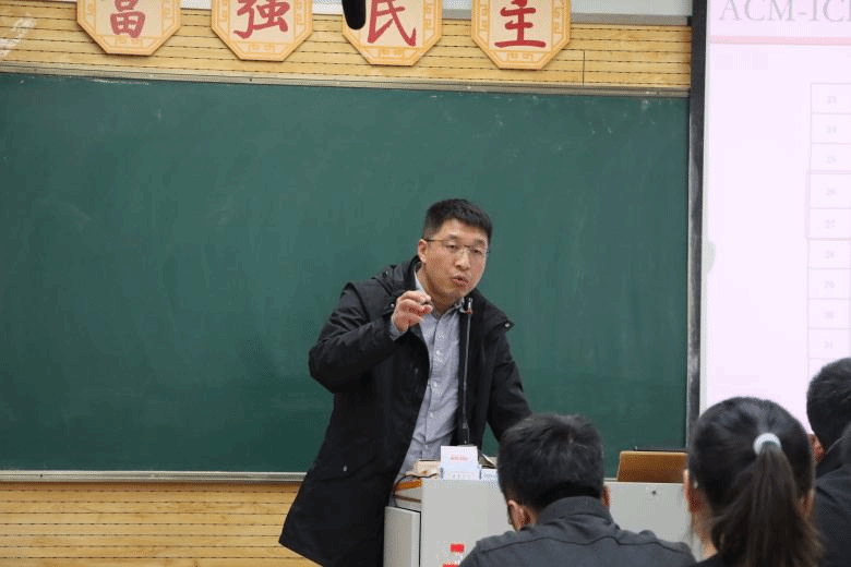 ACM竞赛集训队教练王涛为同学们介绍了ACM竞赛、蓝桥杯等程序设计类竞赛的背景、赛制、要求、评判标准。他特别向学生展示了分站赛学长学姐斩获奖牌的经验,希望同学们能在竞赛中磨练出过硬的专业能力。