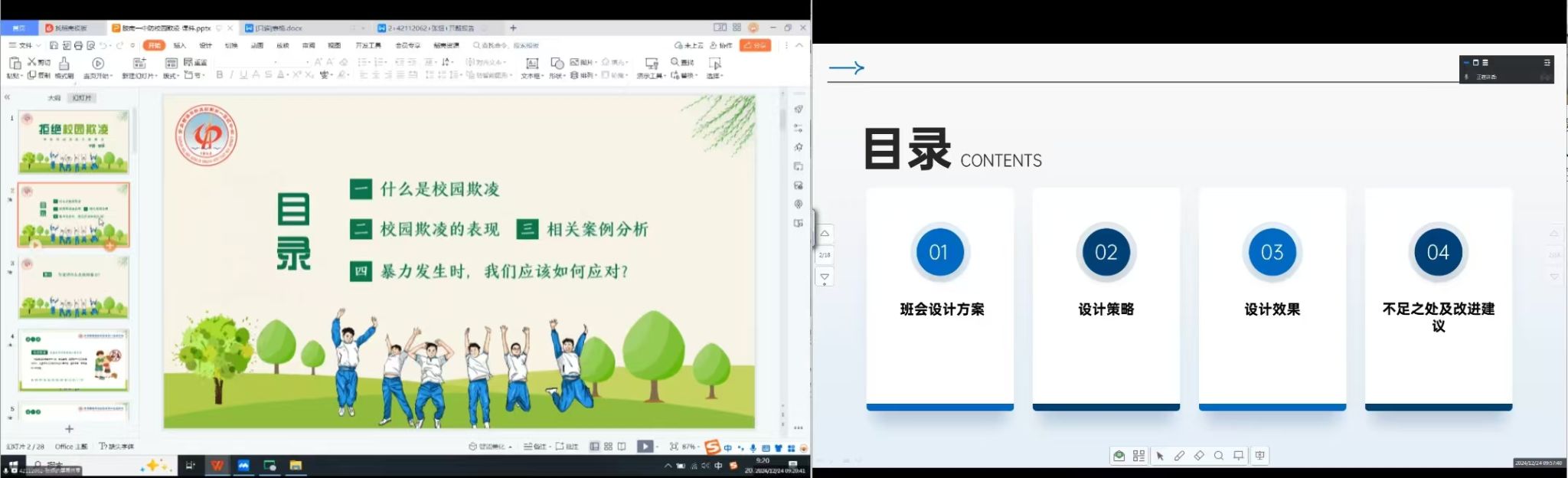 最后,同学们分享了各自的主题班会设计。选题围绕如何预防校园暴力、如何提升学习效率、如何树立远大理想、为什么要认真学习等方面内容展开,详细介绍了班会的具体内容、开展形式以及学生参与情况等。通过主题班会研习,有效解决了学生在生活和学习中遇到的问题,进一步增进了师生之间的沟通与交流。