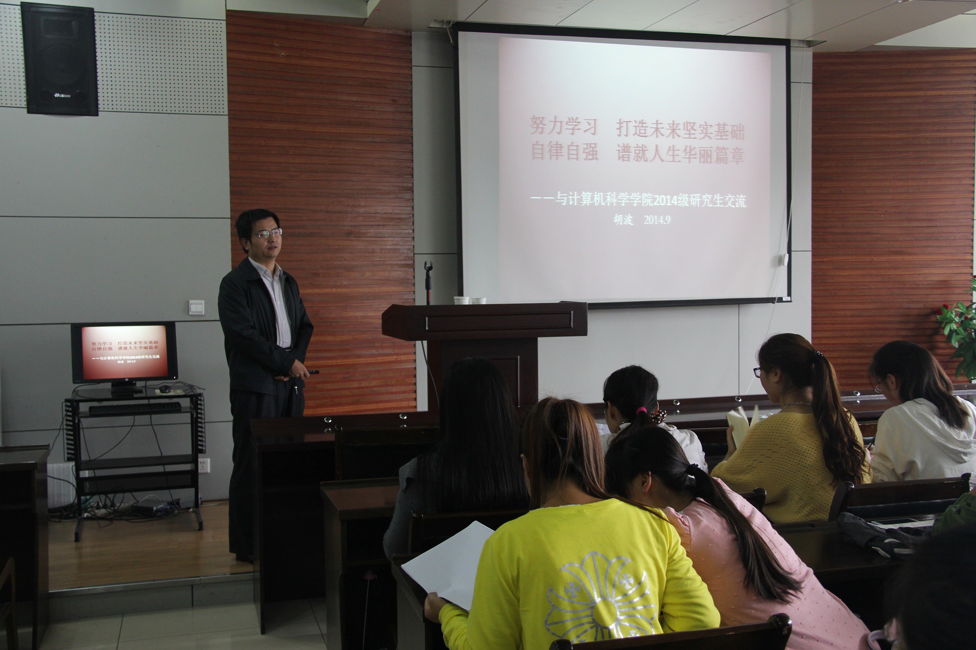 9月16日下午3点,91猫先生 2014年研究生新生入学教育报告继续举行。计科院党委书记胡波老师做了题为“努力学习,打造未来坚实基础;自律自强,谱就人生华丽篇章”的报告。报告中,胡波老师从何为研究生,研究生与本科生的区别,学习成本,学习榜样几个角度向新一级研究生介绍了读研的主要目标,研究生期间的学习之道,以及读研期间所需的付出,并鼓励同学们以施一公等知名人物为榜样,心怀远大目标,保持恒心。