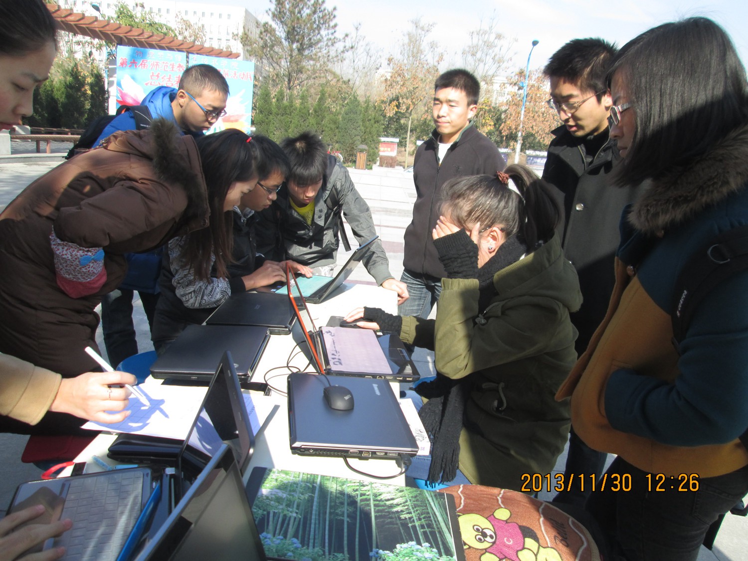 早晨九点,成员们就做好了各项准备,活动一开始就吸引了很多同学前来围观,现场气氛非常热烈,虽然天气很冷,但是大家一点也不在意,都是忙得不亦乐乎,在各自的战场上,挥洒着热情,尽心尽力为大家服务。本次活动共计帮助了50多位同学,解决了“重装系统”,“开机速度慢”,“系统分区”,“装不上个别学习软件”等诸多问题,获得了大家的一致好评。特别是华葱、张辉、向昌成,李晨,刘冬青等几位同学,不仅尽心尽力帮助同学们解决当前难题,还热心的给大家讲解了解决方法及平常会遇到的一些其他电脑问题,使得本次活动充实而圆满。