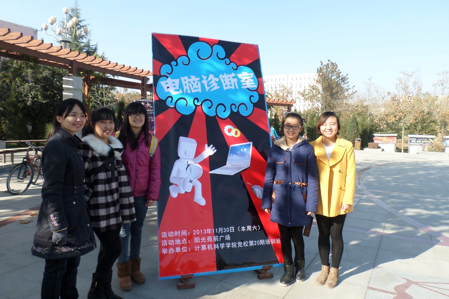 第20期党课11级的实践小组在阳光苑的广场上开展了“电脑诊断室”的电脑义务维修活动。本次活动由胡雯洁老师和李勇俊老师指导,樊迪同学负责。小组32人全部参加了此次活动,旨在利用专业知识帮助全校同学解决一些电脑故障,解答一些计算机方面的疑惑与难题。