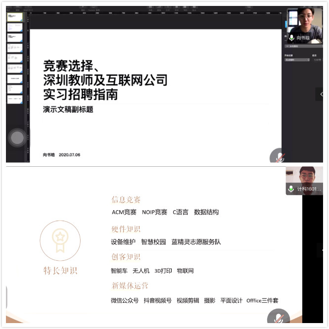 会议开始,袁冰就本次分享会的目的和内容进行了说明,指出过去在师范生中间存在的问题,提出了对同学们的期许。随后,安琪为同学们介绍了本次会议上进行经验分享的毕业生代表,分别是来自2016级计算机科学与技术专业的隋丰隆、冯苗苗、何向前和向书晗。4位同学各有侧重,分别从专业学习、干部服务、学生活动、科研竞赛等方面介绍了自己的经历经验。