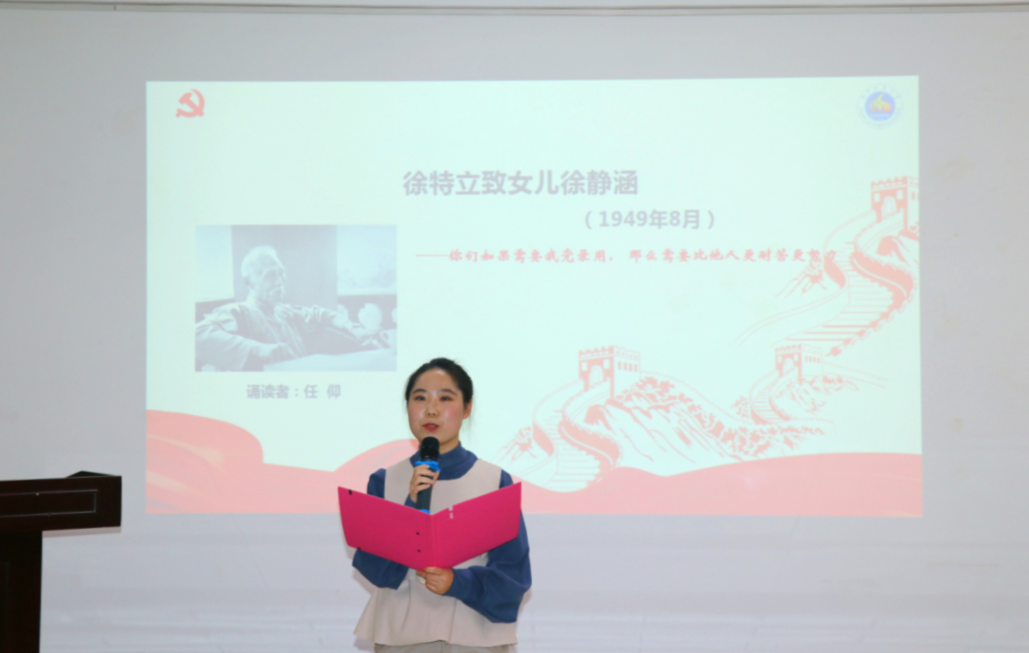 研究生党支部书记、2019级计算机软件理论专业硕士任仰同志诵读了徐特立致女儿徐静涵的家书,“你们如果需要我党录用,那么需要比他人更耐苦更努力”。徐特立勉励女儿在党外也做贡献、在政治上要求进步、关心国家的振兴。