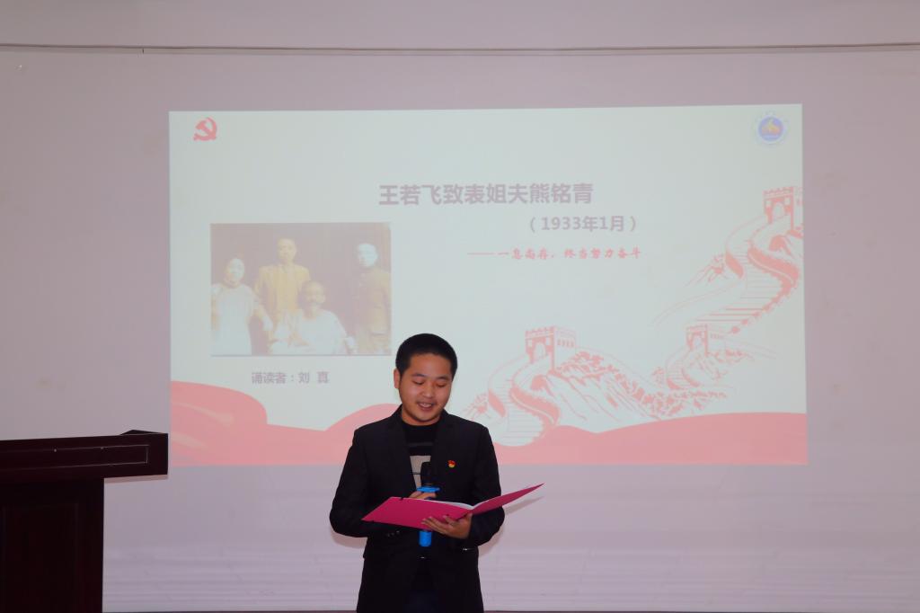2017级计算机科学与技术专业本科生刘真诵读了王若飞致表姐夫熊铭青的家书,“一息尚存,终当努力奋斗”,对自己在监狱的生活进行了描写,抒发了内心的强大力量