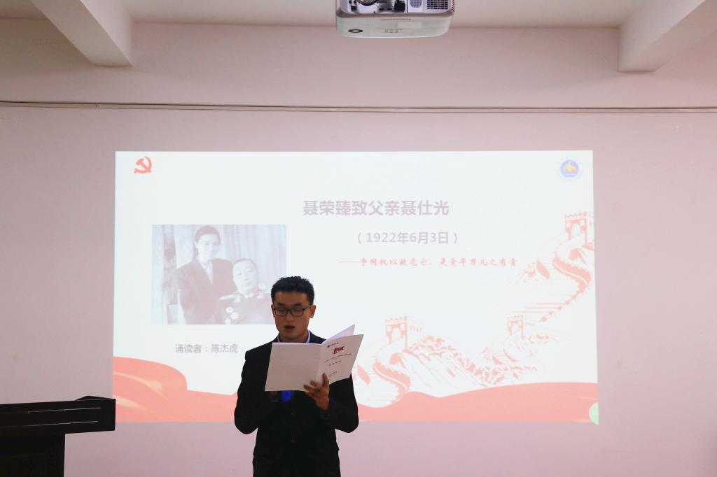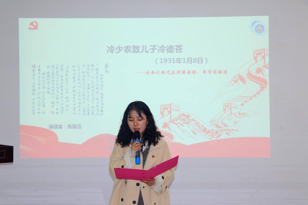 学院团委副书记、2017级计算机科学与技术专业陈慧洁同志诵读了冷少农致儿子冷德苍的家书,“社会之新光在照耀着你,希望你猛进”。这一封信寄托着冷少农对儿子无尽的爱和深切的期望,体现了革命者超越小我、献身革命的大爱。
