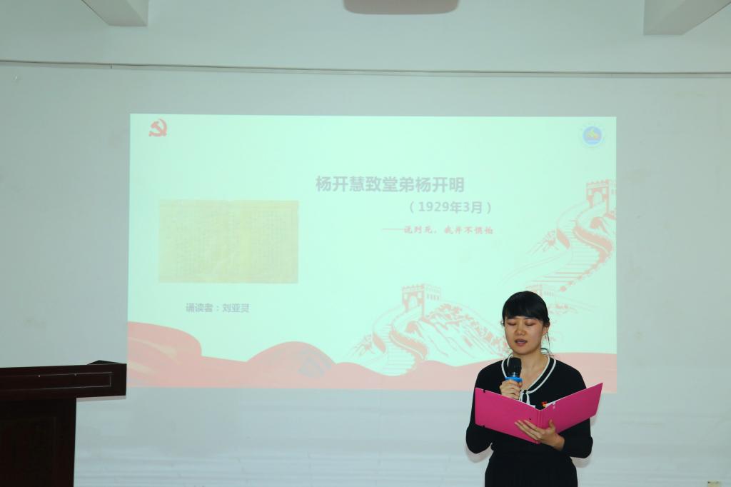 研究生党支部书记、2018级计算机应用技术专业硕士刘亚灵同志诵读了杨开慧致堂弟杨开明的家书,“说到死我并不惧怕”。信中,杨开慧流露出作为女性柔弱的一面,但她更多地表现出不同于一般女子的坚定和勇敢。