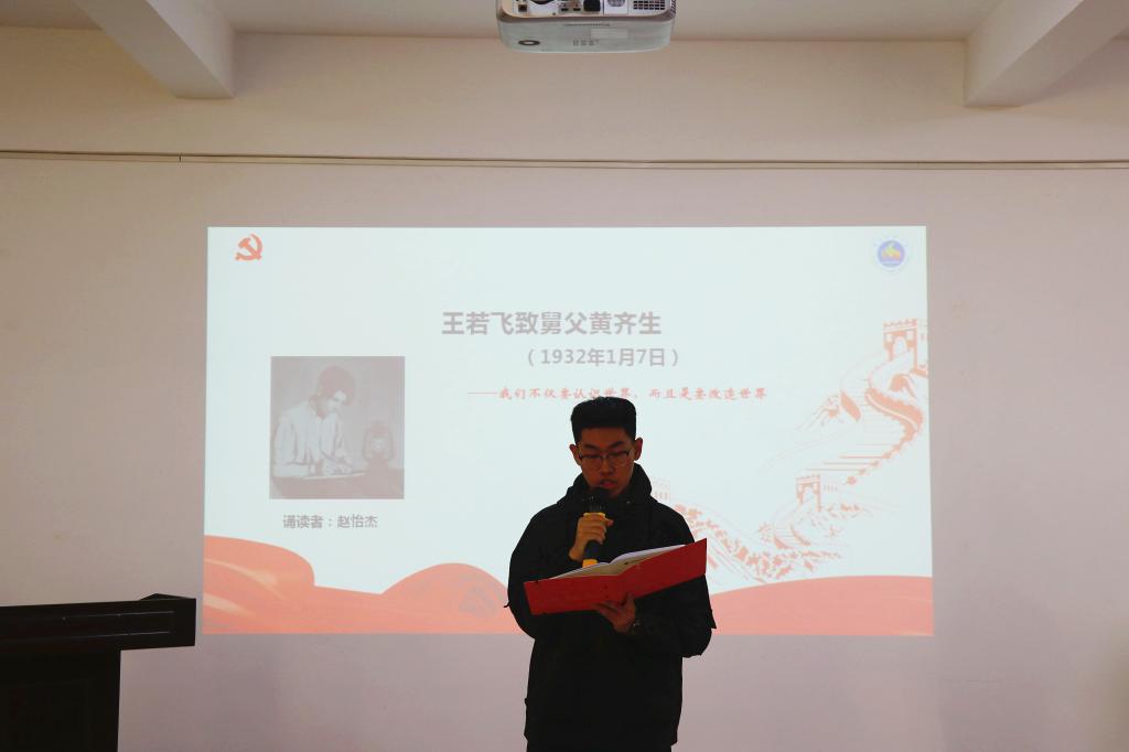 校学生会副主席、2017级软件工程专业本科生赵怡杰诵读了王若飞致舅父黄齐生的家书,“我们不仅要认识世界,而且是要改造世界”,体现了王若飞以至亲至诚的情义进行两代人之间的深刻交流。