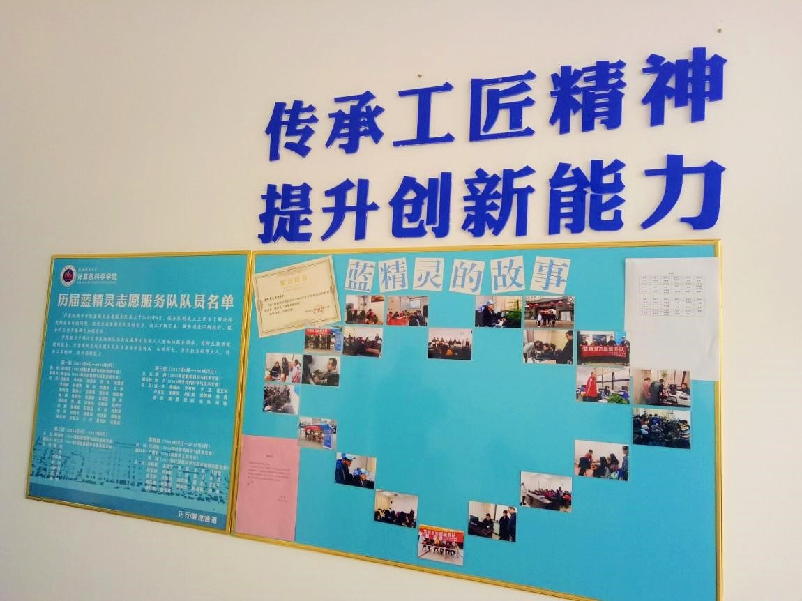 蓝精灵志愿服务队由计算机科学与技术、软件工程、信息管理与信息系统专业各年级优秀本科生组成,主要解决校内师生电脑故障问题。学院加强对蓝精灵志愿服务队的工作支持与思想引领,探索将党小组建在服务队上,以“传承工匠精神,提升创新能力”为建设与发展理念,引导学生奉献社会、自觉成长成才。