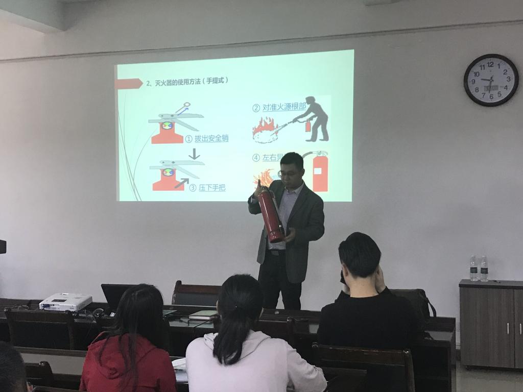 最后,马老师现场演示了灭火器的使用方法,如干粉灭火器:“一拔、二对、三压、四喷”;消火栓的使用则是:“一甩两接拧到底”。同时马老师还总结了一些应用口诀,如:“用器材、识标识、会报警、懂疏散,小火使用灭火器,稍大使用消火栓,难以应对及时撤离报警”,简单形象的口诀,使操作顿时变得简单易学,大家很容易就理解了消防操作要领。