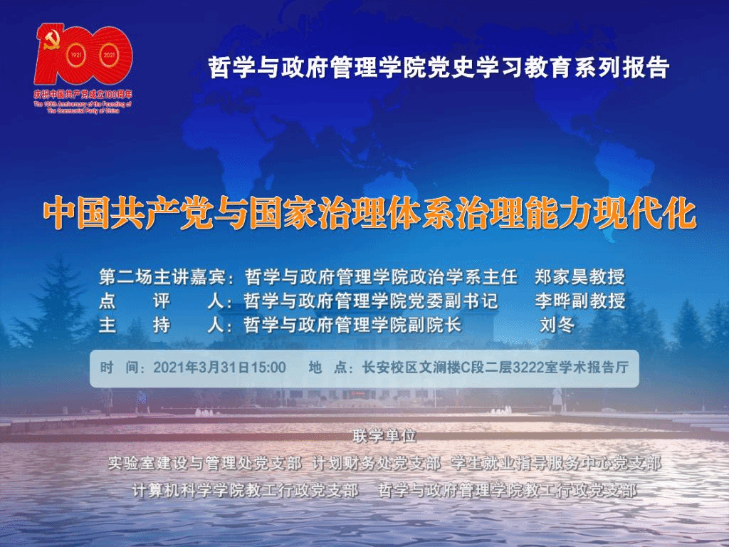 党史学习教育教授宣讲团成员郑家昊教授作的题为《中国共产党与国家治理体系治理能力现代化》党史学习教育报告。