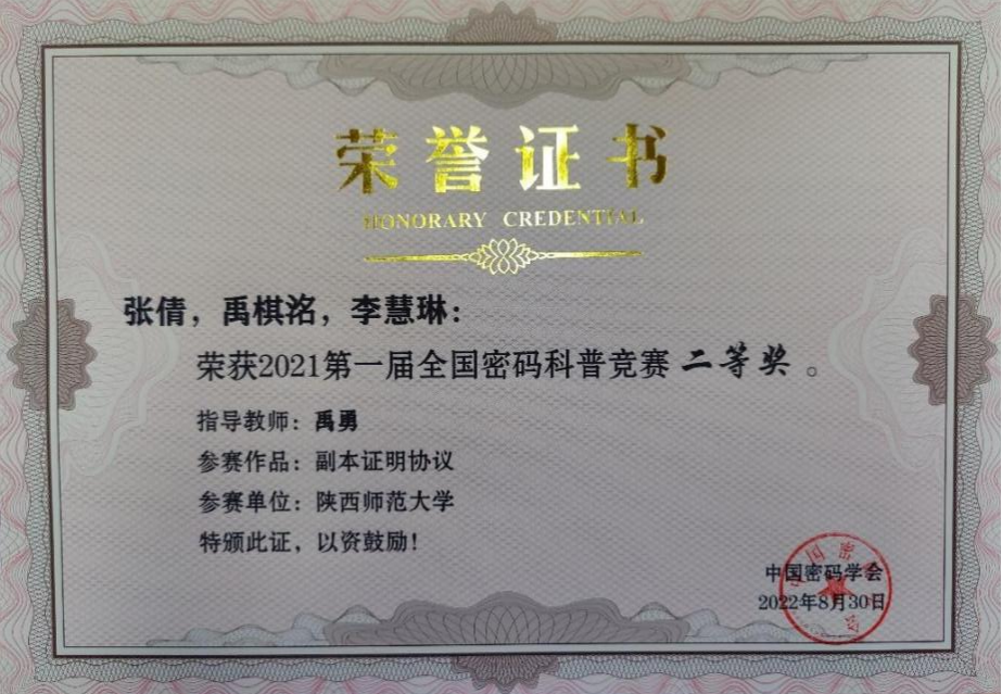 在2022年8月19日举办的由国家密码管理局指导、中国密码学会主办的第一届全国密码科普竞赛中,91猫先生 禹勇教授指导研究生张倩、禹棋洺、李慧琳组队以作品《副本证明协议》参赛,荣获全国二等奖。此次比赛共有全国高校和企业共712支队伍报名参赛,提交602件作品,最终评出2个一等奖,18个二等奖和68个三等奖。