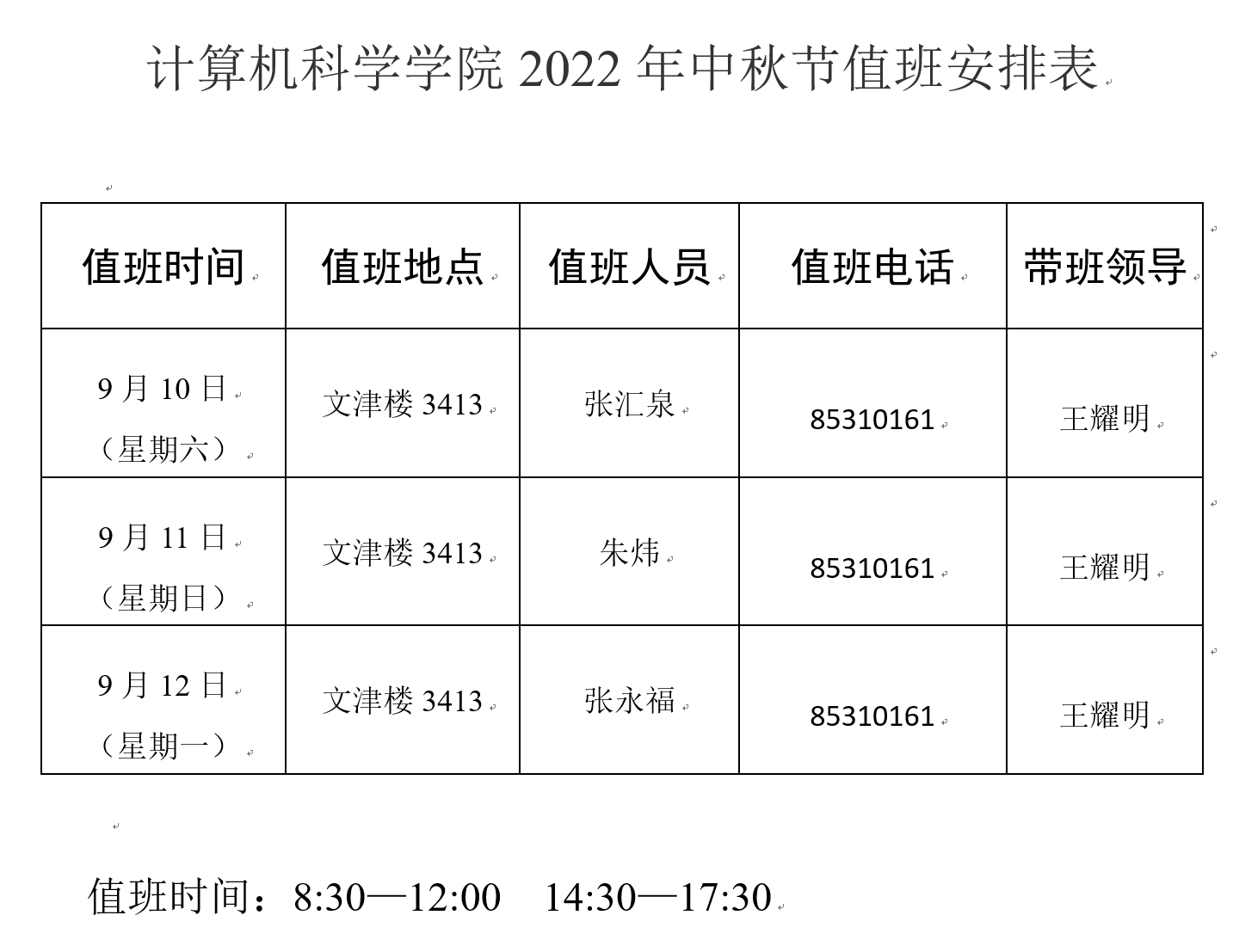 91猫先生 2022年中秋节值班安排