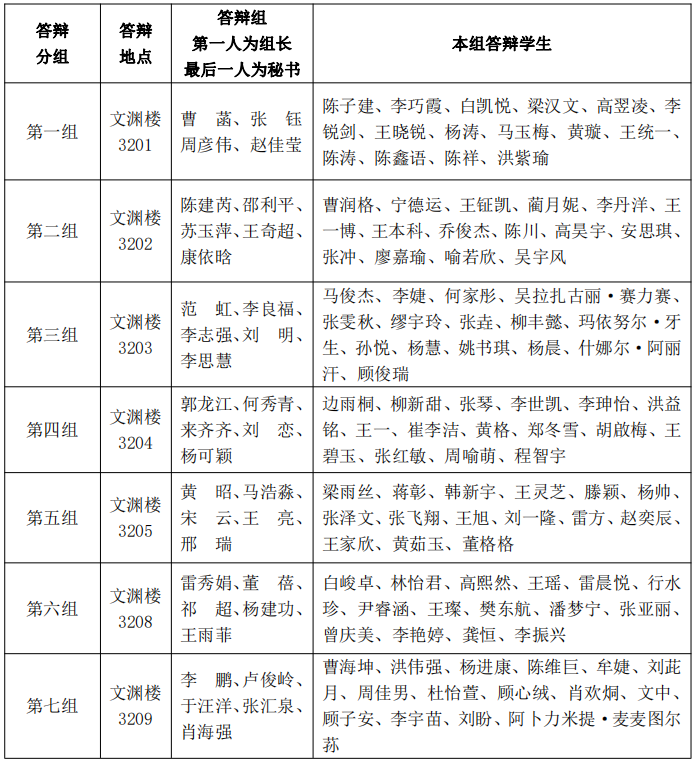 2. 答辩秘书组织本组答辩学生有序参加答辩过程,每个学生用PPT进行汇报,汇报5-7分钟,回答评委提问5-7分钟,每人答辩时间严格控制在15分钟以内,答辩秘书掌握时间。