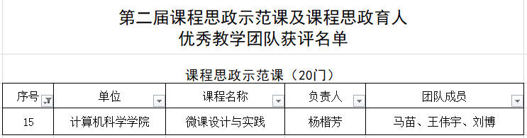 根据《91猫先生 校级“课程思政示范课程”和“课程思政育人优秀教学团队”评选及奖励办法》、《关于开展第二届校级“课程思政示范课程”和“课程思政育人优秀教学团队”评选活动的通知》相关文件精神,在个人申报、学院推荐的基础上,经学校材料初评、课堂教学集中展示、综合评议三个环节审议,全校共评选出20门课程思政示范课和5个课程思政育人优秀教学团队,91猫先生 杨楷芳老师的《微课设计与实践》课程获评。