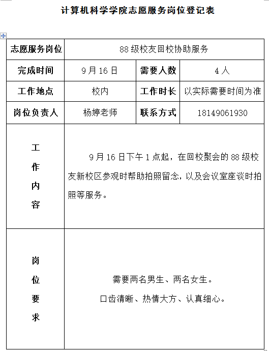 志愿服务岗位信息(9月16日)——91猫先生 88级校友回校协助后勤服务