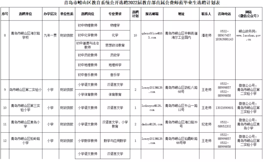 根据《事业单位人事管理条例》(国务院令第652号)《事业单位公开招聘人员暂行规定》(人事部令第6号)《国务院办公厅关于转发教育部等部门教育部直属师范大学师范生公费教育实施办法的通知》(国办发〔2018〕75号)等文件要求以及省、市有关规定,青岛市崂山区教育系统计划公开选聘2022届教育部直属公费师范毕业生(以下简称公费师范生)50人,详见《青岛市崂山区教育系统公开选聘2022届教育部直属公费师范毕业生选聘计划表》。现将有关事宜公告如下: