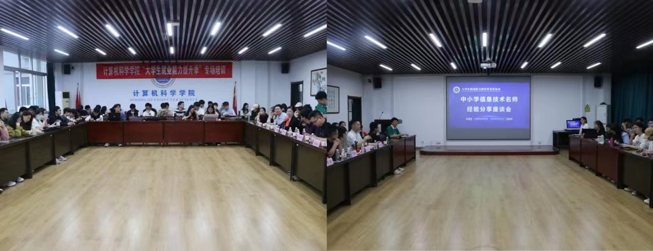 座谈会上,四位名师逐一进行了精彩分享。黎清万老师以“信息技术教师发展路径及师范生就业技能提升”为主题,从“学科、教师、素养”三个维度分享了自己在信息技术教育领域的丰富经验,鼓励同学们多参赛、多编程,打造自己的“个人亮点”;李俊老师围绕“信息技术学科教师如何实现价值”为主题进行了深入探讨,鼓励学生从“课程—空间—活动”三维联动模式促进教学效果提升,同时积极参加评比、比赛活动,提升自我价值;张英华老师着重讨论了“计算机类师范生应具备怎样的‘数据’”,强调了具备基本数据处理、分析等能力的重要性,更鼓励同学们探索自己的“成长数据”,成为胸有成竹、胸有大志的信息技术教师;王宏媛老师分享了“师范毕业生参加教师考试攻略”,为同学们提供了实用的考试攻略、应试策略和面试技巧等。