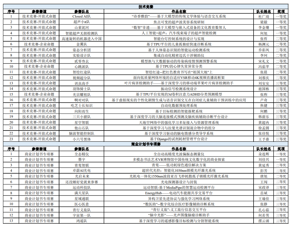 最终,在技术竞赛中,杜广琦等4支参赛队伍同学们的作品分获一等奖,张哲等8支参赛队伍同学们的作品分获二等奖,刘安安等11支参赛队伍同学们的作品分获三等奖;在商业计划书专项赛中,朵连辉等2支参赛队伍同学们的作品分获一等奖,黄延秀等4支参赛队伍同学们的作品分获二等奖,宋政译等7支参赛队伍同学们的作品分获三等奖;梁健等8名老师分获优秀指导教师奖。