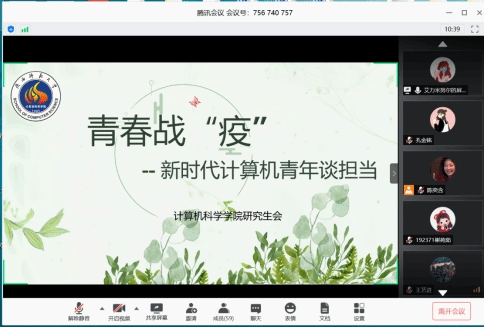 ——青春战“疫”,新时代计算机青年谈担当。5月27日晚7点,本次活动线上召开。活动开始,主持人陈奕含同学带领大家观看了《战“疫”中的新时代中国青年》相关视频;随后,积极参与抗疫工作的志愿者代表宋海林等同学,从自身志愿经历出发,结合疫情期间所思所感,发表感言;活动最后,围绕“疫情期间的青年力量”为主题,同学们深入讨论交流,自由发言,分享了疫情期间的所见所闻和所感所想,并形成文字总结。