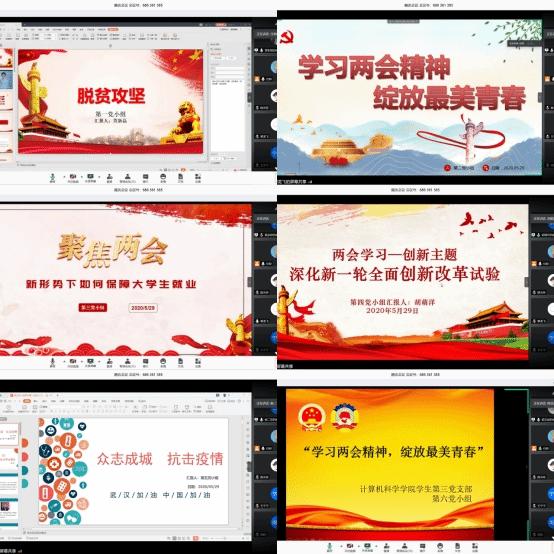 第一党小组贾新磊通过从百度百科看脱贫攻坚、回顾两会中脱贫攻坚、从贫困县摘帽看脱贫攻坚、学习脱贫攻坚战中的英雄四个方面进行脱贫攻坚主题分享;第二党小组郭龙飞从《政府工作报告》中有关教育的六句话入手,详细展开进行教育主题的探讨;第三党小组黄依婷结合两会内容及当前形势,通过数据、视频等多种形式,分四个部分进行了“新形势下如何保障大学生就业”的介绍;第四党小组胡萌洋围绕政府工作报告、代表委员们关于“科技”、“创新”的重要声音、“新基建”等从政策改革、科技创新两方面展开创新主题介绍;第五党小组成员分别从张伯礼院士两会提议、全力抗疫凸显我国制度优势等不同角度结合两会内容进行抗疫主题的分享;第六小组围绕两会中有关高等教育的提案和建议展开了热烈讨论。各党小组准备充分,内容详实。