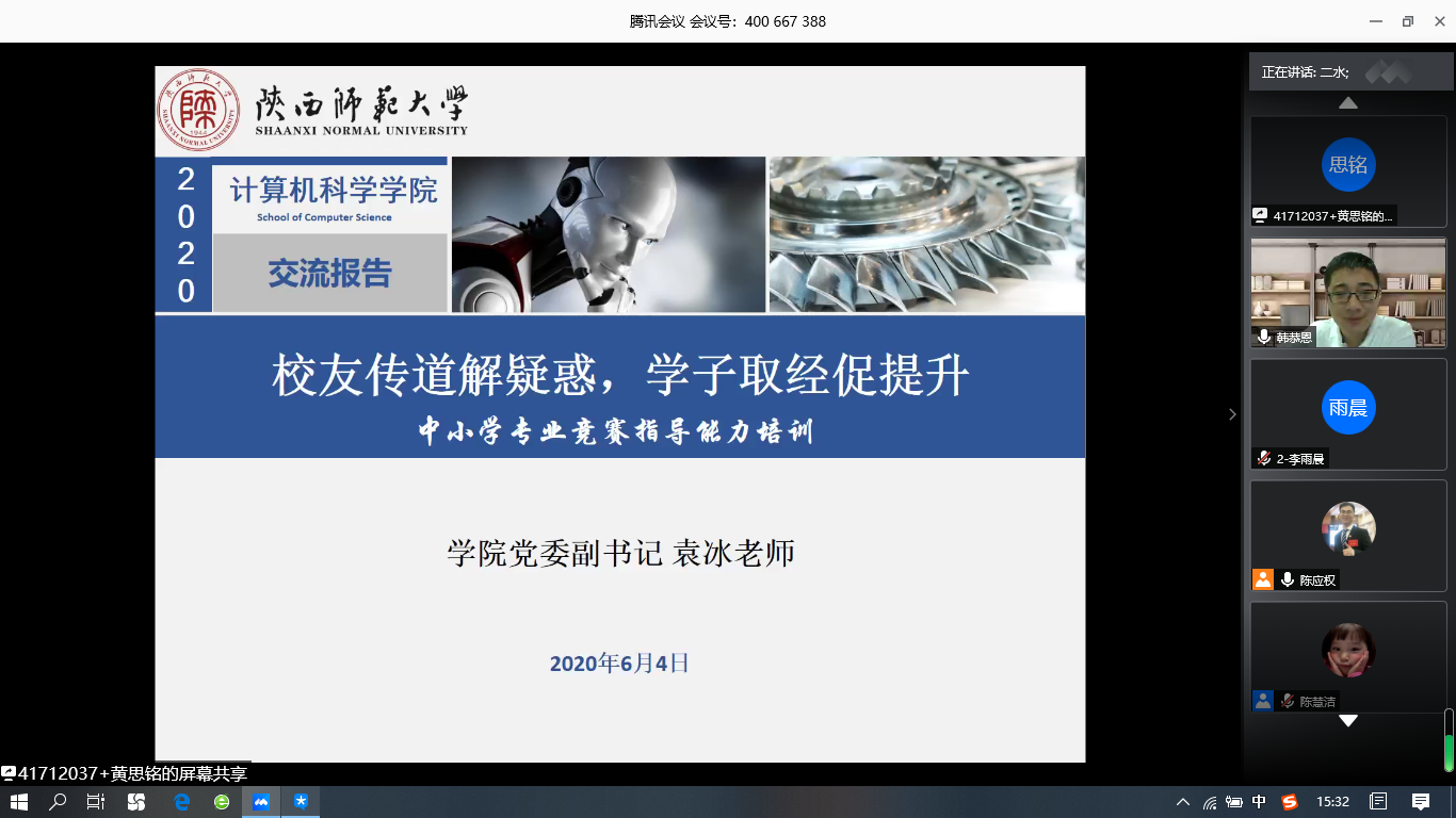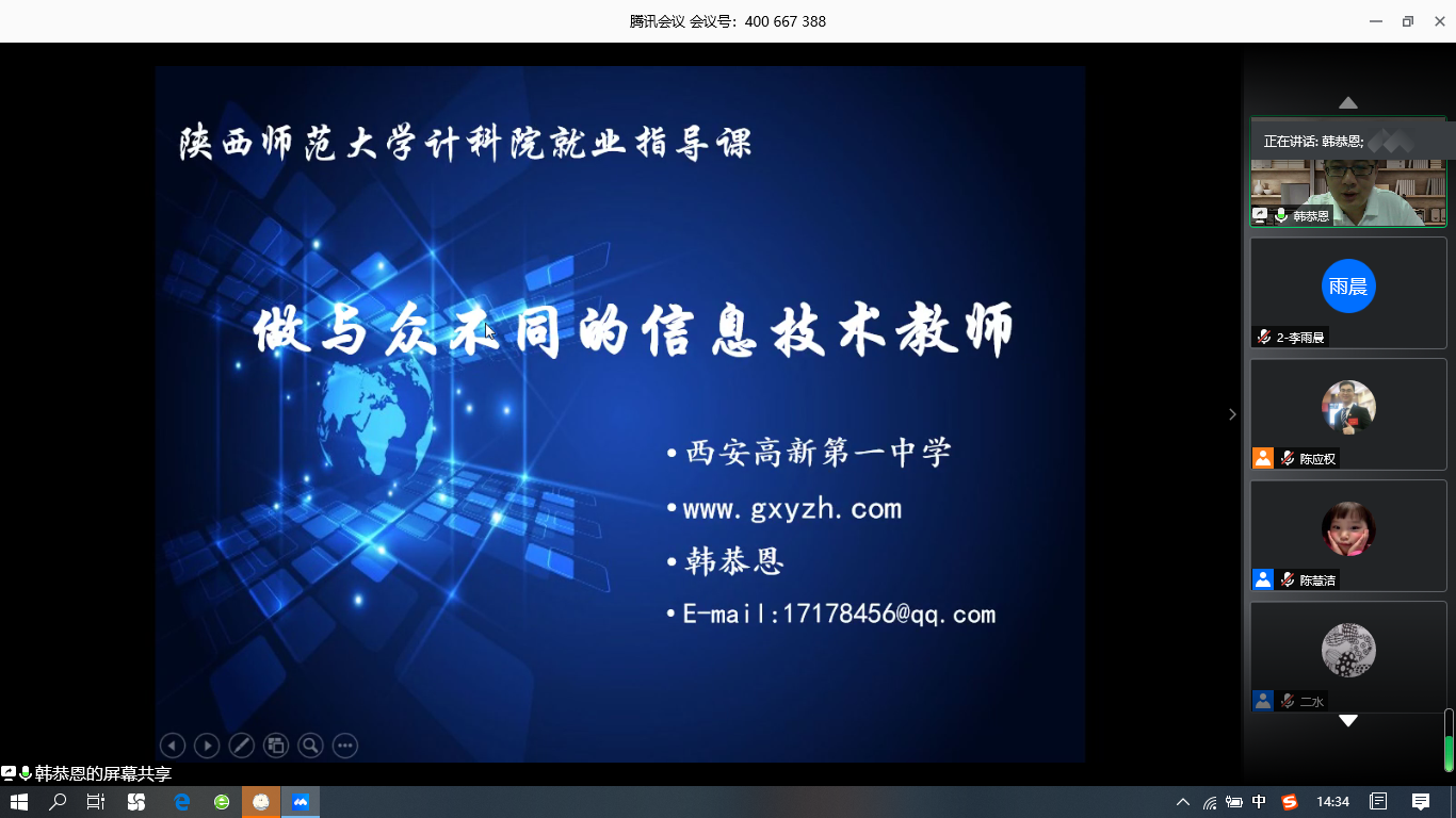 2002届计算机科学与技术专业优秀校友韩恭恩老师为大家做分享。学院党委副书记袁冰、2017级计算机科学与技术师范专业全体本科生参加了本次就业指导课,就业指导课由2017级本科生辅导员陈应权主持。