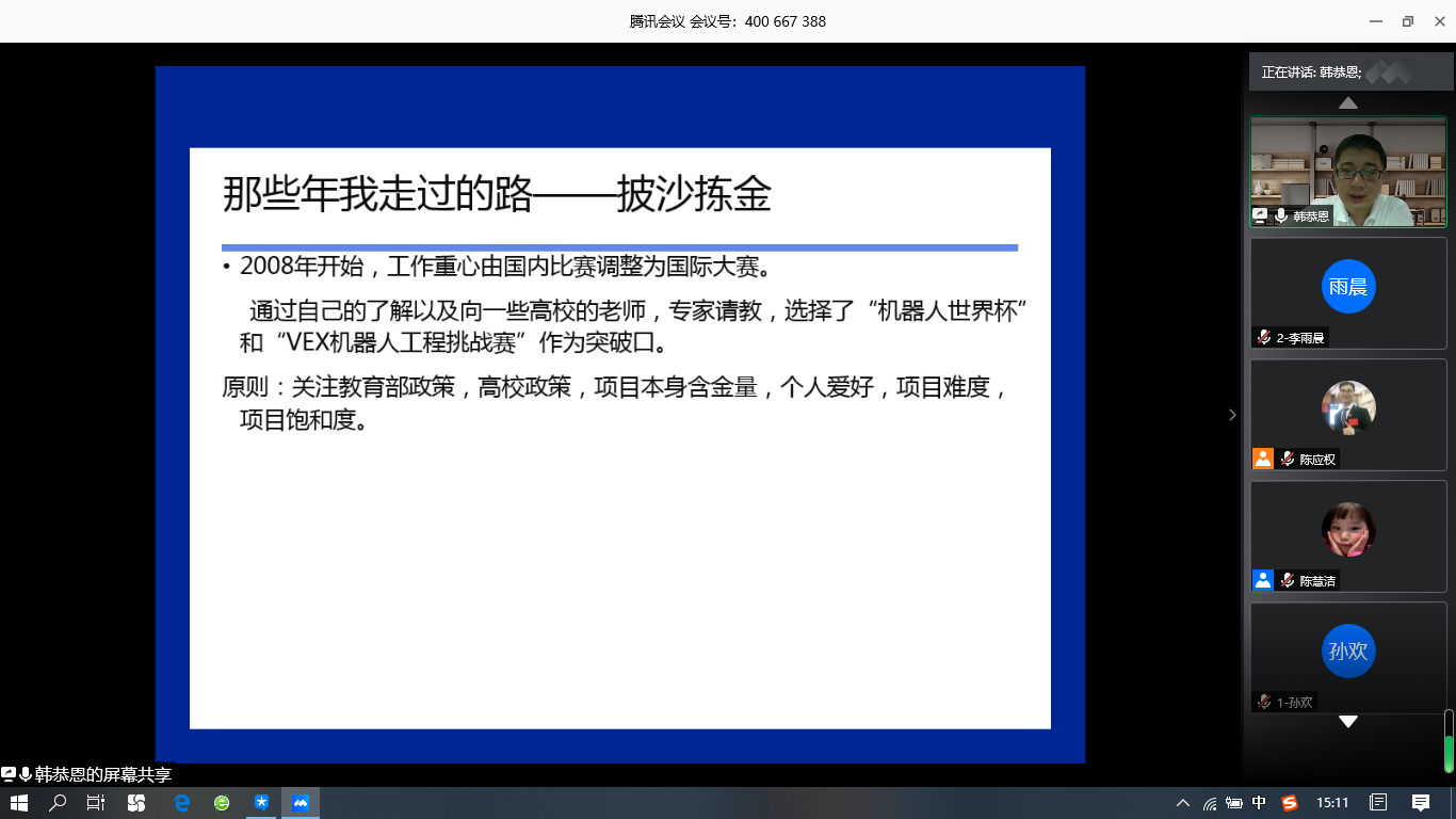 韩恭恩老师现任西安高新第一中学信息技术高级教师,并担任学校创新机器人竞赛辅导教师。韩恭恩老师同时身兼中国科协机器人专家库成员,中国人工智能学会中小学工作委员会副秘书长,机器人竞赛国家级裁判员、教练员,青少年机器人世界杯中国区组委会足球项目组主任等职务。