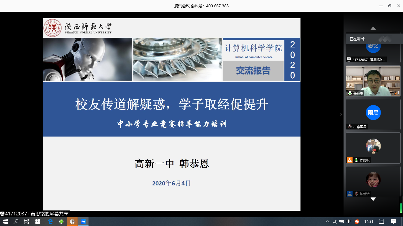 韩恭恩老师向同学们介绍了人工智能目前的发展情况和对社会的重要影响,他认为作为计算机专业的学生应该充满专业自信,也应该对自己的未来充满信心。韩老师强调,除了本职的基础课程教学工作以外,每个人都应该有自己的特色和爱好,要学会根据自己的特色找到自己的突破点,使之成为自己的特色内容。作为中小学信息技术教师,可以利用自己的专业优势,带领学生在校内开展一些相关的科技活动,例如机器人社团、信息学奥赛、航模社团、木工建模等。在讲授了一系列信息技术教师相关的专业知识后,韩恭恩老师结合自身的工作经历,告诉大家在走上社会之后,会面临许多机遇和挑战,也会有过迷茫和彷徨,但不论是小有成就还是闭门练功的阶段,都应该坚定地走自己想走的路,并为之付出努力,坦诚对待他人,尊重对手,提升自己。“厚德载物、天道酬勤”,只要不断进取、努力提升自己的能力,都将在自己热爱的工作岗位上发光发热。随后,韩恭恩老师针对同学们的提问进行了答疑。