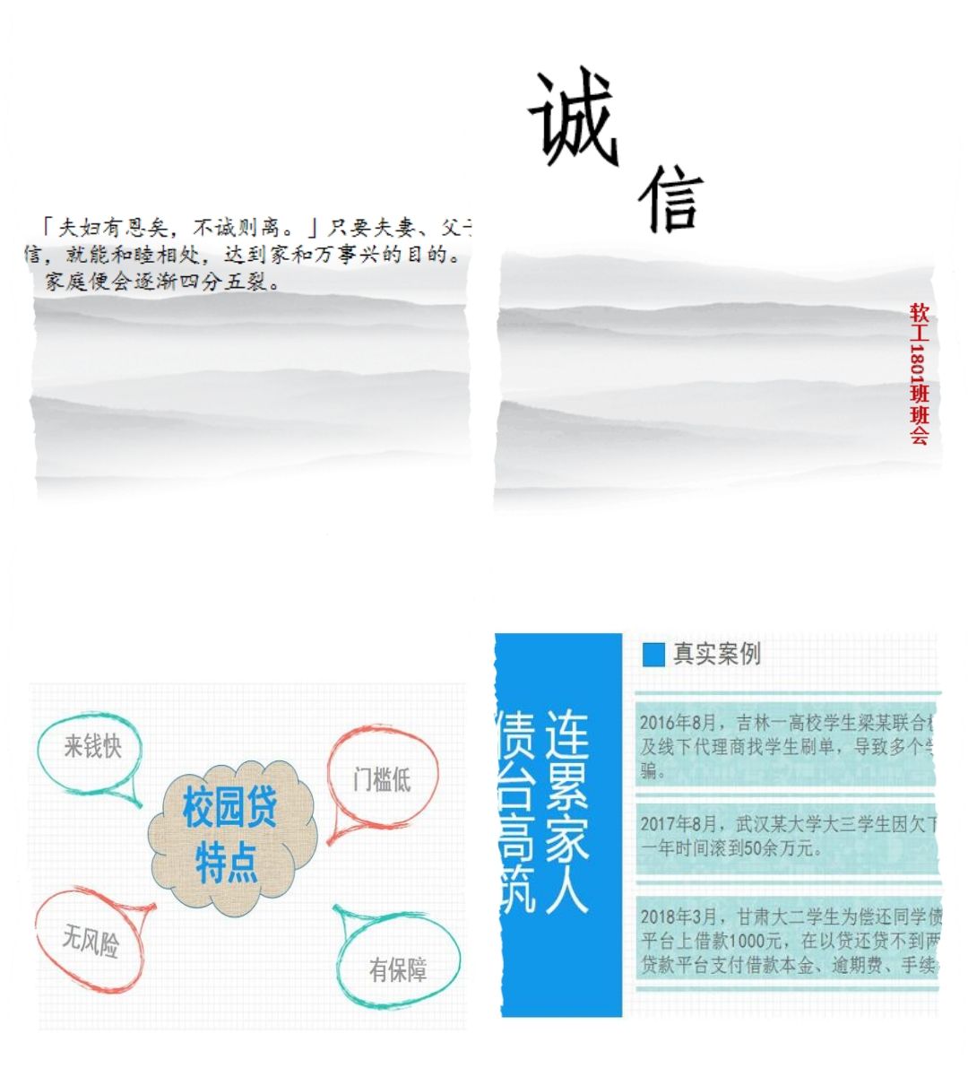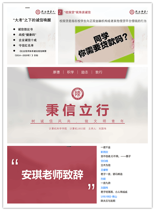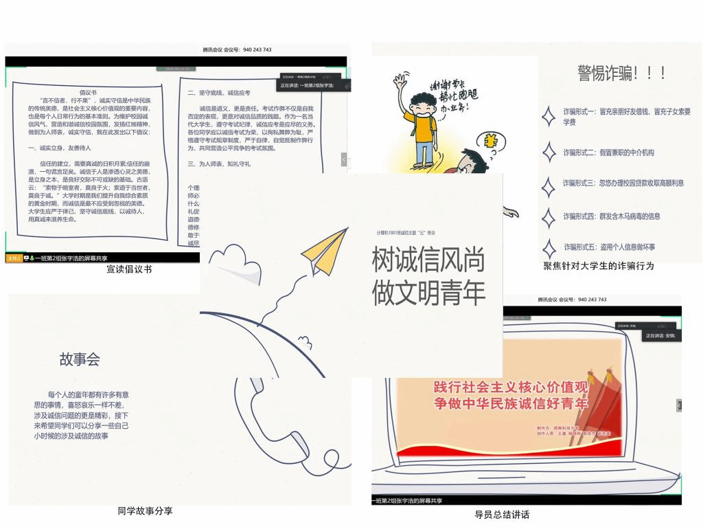 计算机科学与技术1801班以时间为脉络,开展主题为“树诚信风尚,做文明青年”的线上班会。从小时候“借口不写寒假作业”到现在“专门准对大学生的骗局”,整理分享了从小到大我们的亲身经历。通过回忆父母、老师在我们成长过程中的谆谆教诲,让我们坚守诚信。班会的最后,通过展示分享防骗知识,提高同学们的防骗意识。