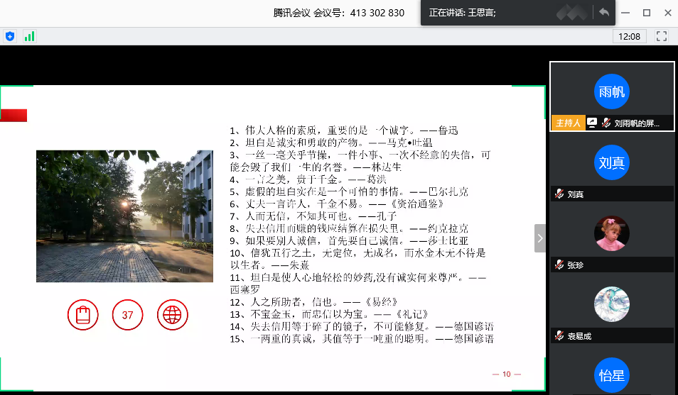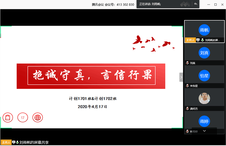 计创1701、1702班联合举办了“抱诚守真,言信行果”线上主题班会。本次活动由两班班长刘雨帆、王思言主持,计创专业全体同学参加了本次活动。