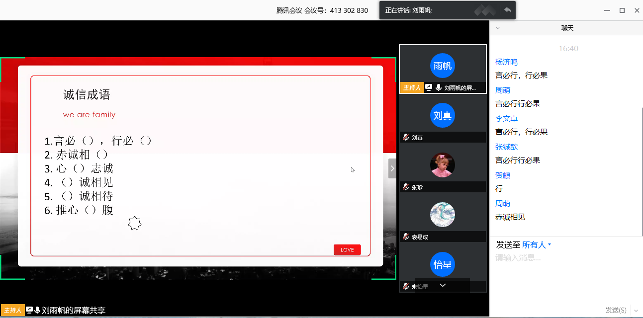“失信于人者,一旦遭难只有坐以待毙。”活动伊始,王思言以三个诚信小故事切入本次主题。她表示,“诚信是中华民族的优良传统,是做人和做事的道德核心。倘若一个人失去了诚信,那他也就失去了一切。”接着,王思言带领全体同学回顾了有关诚信的格言。通过这些积淀了历史风韵的词句,同学们进一步认识到了诚信的重要性,理解了古人对守信的推崇和对失信的鄙弃。随后,刘雨帆以“成语填空”的小游戏寓教于乐,进一步激发了同学们对诚信的深层理解。在该环节中,全体同学积极主动参与评论区的互动,认真学习了诚信成语的正确写法和释义。之后,同学们互相交流了自己身边的诚信故事。李嘉琪讲述了身边的学生在疫情期间坚持学习努力、同时帮助工厂复工以挣得工资按时偿还助学贷款的诚信故事,体现了当代大学生诚信做人、自立自强的品格。宋澳华则讲述了自己童年时期遇到的反面案例,通过反面教材强调了诚信做人的重要性。通过对身边人、眼前事的叙述,全体同学有了更深刻思考。