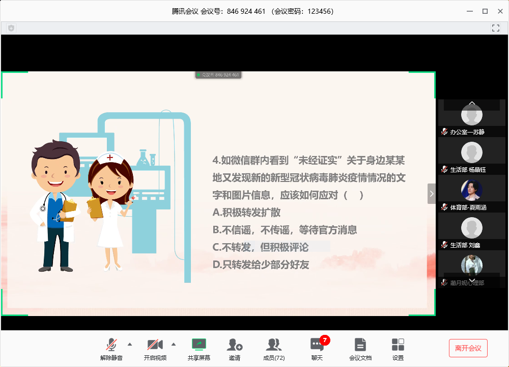 会议进入“计科云时间”部分,针对这次的新型冠状病毒疫情,主要分为三个模块:疫情防控学习、身边疫情现状和知识竞答。