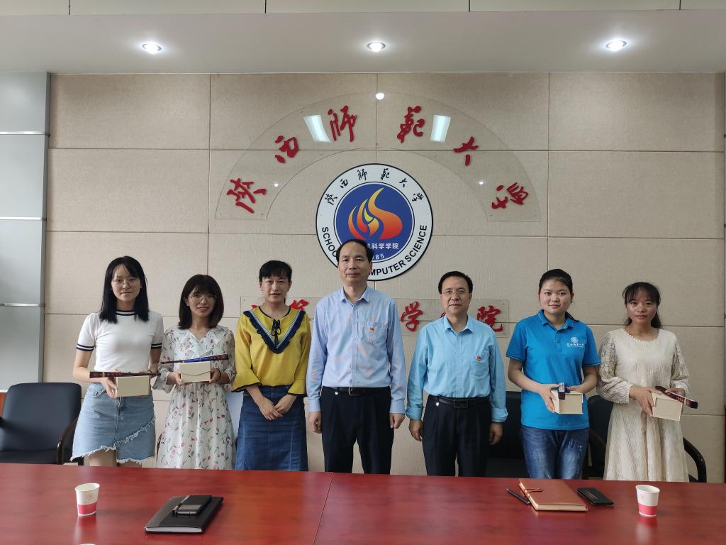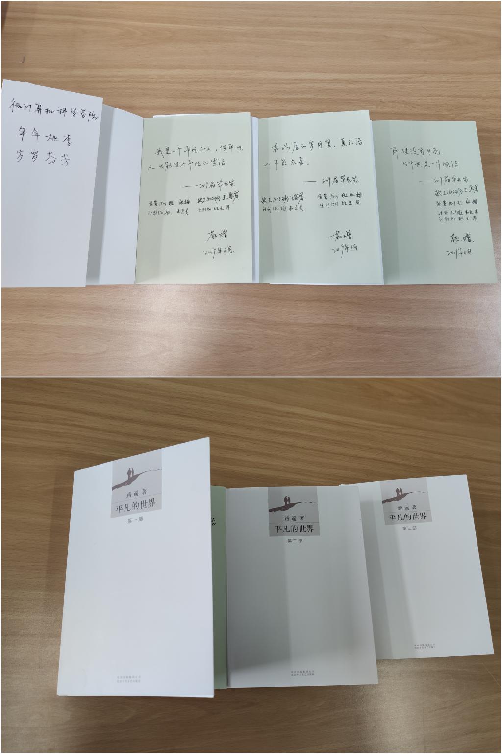 最后,学院院长王小明和党委书记黄怀平代表学院为四位同学赠送礼物,陕师大竹制笔筒、印有“抱道不曲,拥书自雄”的纪念扇和印有陕师大logo的纪念笔,希望同学们能传承学校和学院的优良传统与精神,扎根基层,为社会主义现代化发光发热。同时,同学们送给学院一套《平凡的世界》,并在扉页上写下了对学院的美好祝愿。