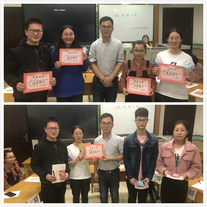 最后,经过评委打分、观众投票,反方获得了本场辩论赛的胜利。正方三辩温梦雪、反方三辩汪小琦获得最佳辩手;正方一辩马海梅、反方二辩蔡帅获得优秀辩手。陈应权老师为其颁发了荣誉证书和奖品,以资鼓励。